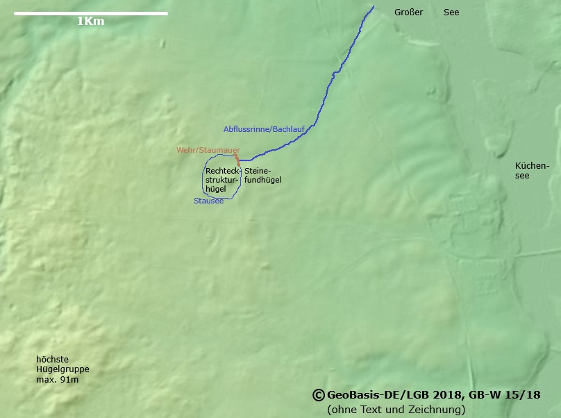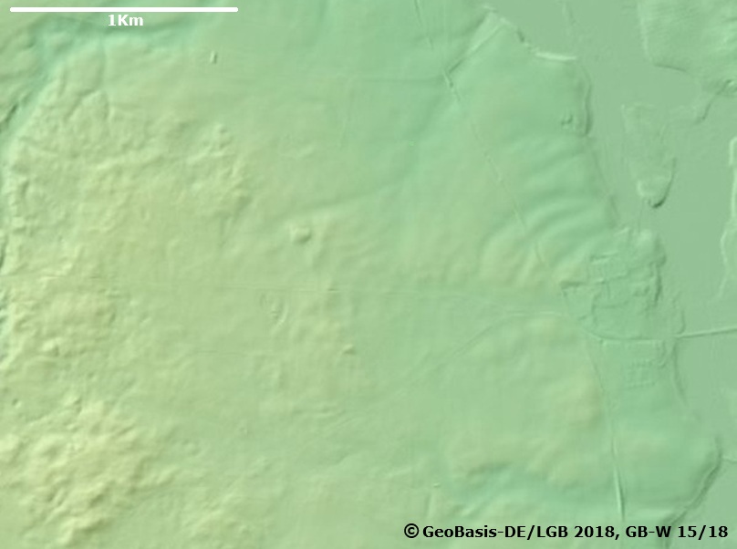 Eintrag Juli 2019: Das mögliche Niederschlag-Einflussgebiet ist rund 1Km² groß, so das ich meinen lange gehegten Verdacht hier nun formuliere - da wo jetzt der Feldweg durch die Abflussrinne verläuft bis hin zum helleren, Feuerstein bestücktem Areal am Hügel auf dem Acker gab es eine gezielt errichtete Stauung. Bei den Buchstaben "Ab..." von Abflußrinne im Bild ganz oben. Die Niederschlagsmengen sollten mehrmals seit Verschwinden der letzten Vereisung vor zirka 17.800 Jahren ausgereicht haben, um dadurch einen künstlichen, bis zu 3m tiefen, fast schon See aufzustauen. Die wahrscheinlich vor der Beackerung, auf einer damals noch nicht möglichen Profilkarte, schwach erkennbare Staustufe ist nun weggepflügt. Für Fischhaltung das erstemal mal hier vor ?tausend Jahren?